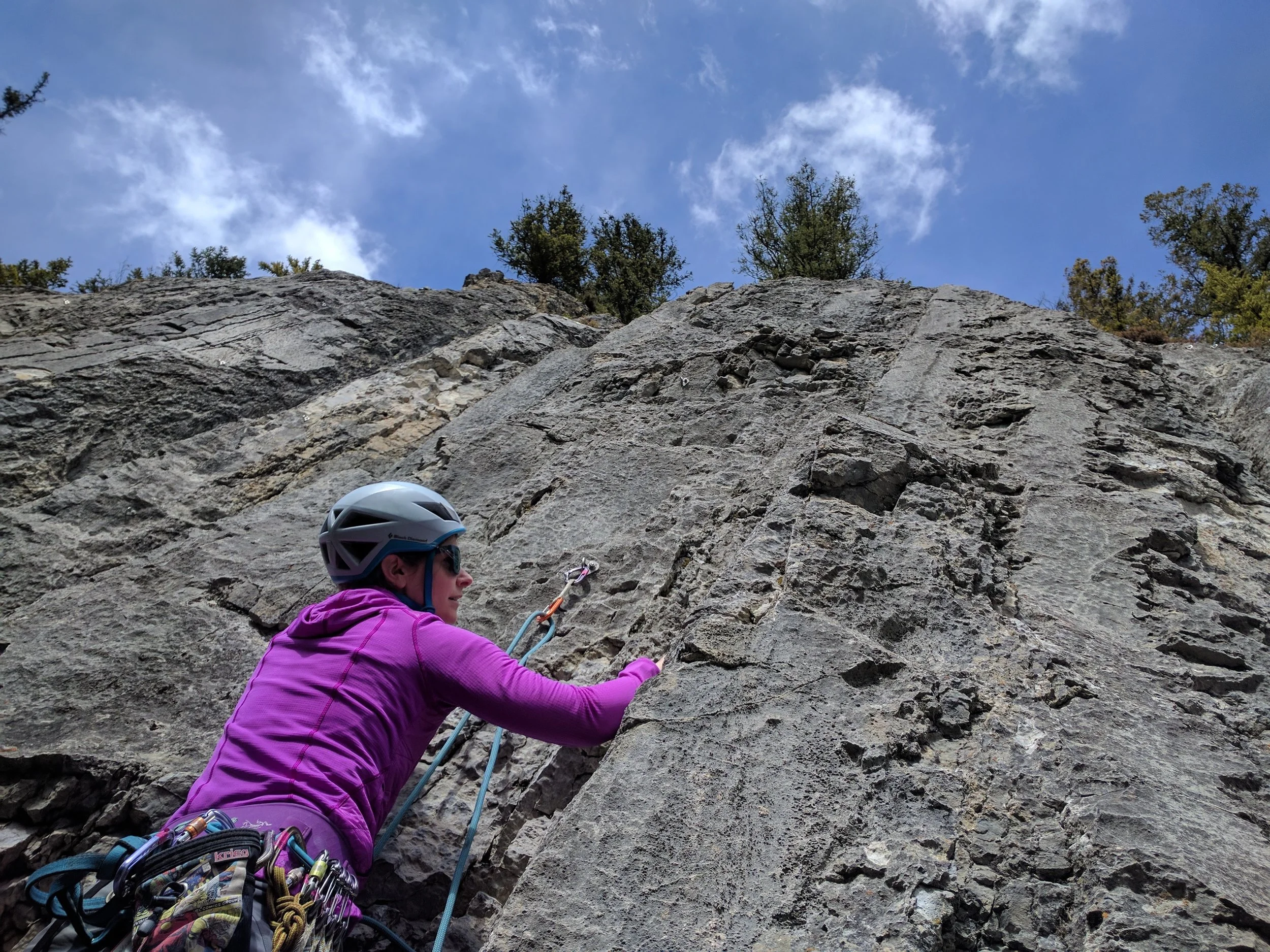We definitely weren't the only people who ended up there - there were a number of other parties sharing the crag with us. We scrambled up to 'The Ledge' which we had entirely to ourselves and then starting all the way climber's right at Panoramic (5.7) we just worked our way across the crag to the Geez Louise - a super fun and super balancy 5.10b.